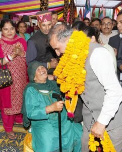 प्रदेश मुख्यमंत्री ठाकुर सुखविंद्र सिंह सुक्खू बड़सर में बुजुर्ग महिला से बातचीत करते हुए