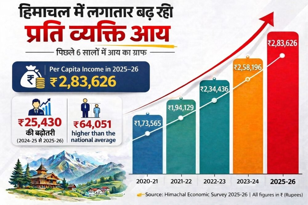 हिमाचल प्रदेश की अर्थव्यवस्था लगातार मजबूत हो रही है। आर्थिक सर्वेक्षण 2025-26 में यह बात साफ सामने आई है। मुख्यमंत्री सुखविंद्र सिंह सुक्खू ने शुक्रवार को विधानसभा में यह रिपोर्ट पेश की। इसमें राज्य की आय, विकास दर, रोजगार और पर्यटन से जुड़े अहम आंकड़े दिए गए हैं। सबसे बड़ी बात यह है कि हिमाचल के लोगों की औसत कमाई बढ़ी है। राज्य की प्रति व्यक्ति आय 25,430 रुपये बढ़कर 2,83,626 रुपये हो गई है। पहले यह 2,58,196 रुपये थी। खास बात यह है कि यह राष्ट्रीय औसत से भी काफी ज्यादा है, यानी हिमाचल के लोग देश के औसत से बेहतर स्थिति में हैं।