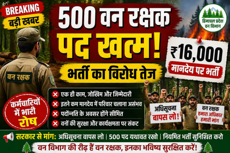 500 वन रक्षक पद समाप्त कर ₹16,000 प्रतिमाह मानदेय पर सहायक वन रक्षक रखने के निर्णय से वन विभाग के कर्मचारियों में भारी रोष है। फॉरेस्टर्स वेलफेयर एसोसिएशन, वन वृत्त रामपुर ने हिमाचल प्रदेश सरकार द्वारा जारी अधिसूचना संख्या FFE-A(B)2-2/2026 दिनांक 28 अप्रैल 2026 पर कड़ा विरोध जताते हुए इसे वापस लेने की मांग की है और मुख्यमंत्री से इस मामले में व्यक्तिगत हस्तक्षेप कर कर्मचारियों के भविष्य और वन विभाग की गरिमा की रक्षा करने की अपील की है।