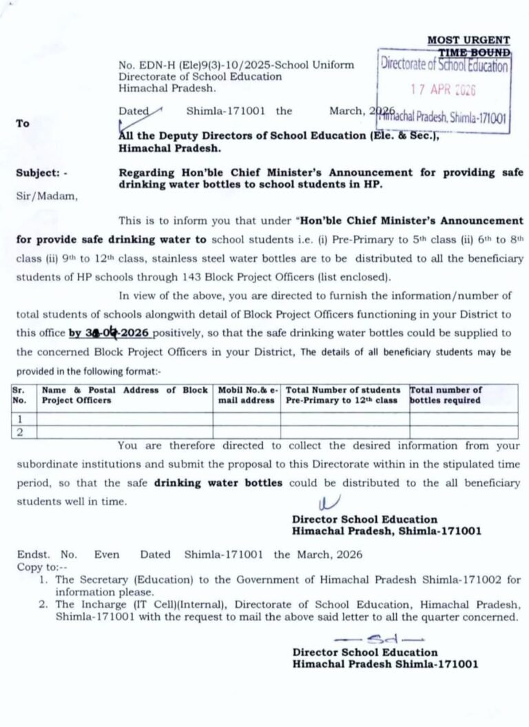 हिमाचल प्रदेश के सभी सरकारी स्कूलों में प्री-प्राइमरी से 12वीं तक के छात्रों को स्टेनलेस स्टील की पानी की बोतलें वितरित की जाएंगी। शिक्षा निदेशालय ने इसे ‘Most Urgent’ और ‘Time Bound’ योजना बताया है।