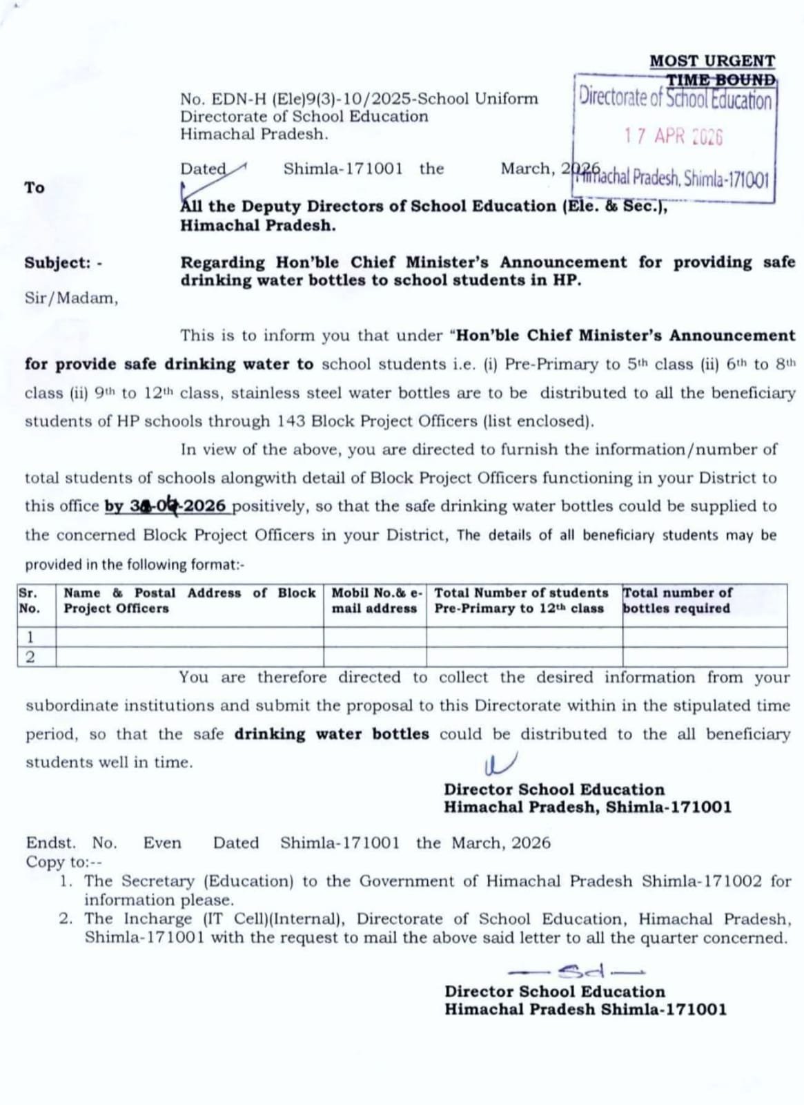 हिमाचल प्रदेश स्कूल शिक्षा निदेशालय ने प्रदेश के सभी स्कूलों में अध्ययनरत छात्रों को सुरक्षित पेयजल उपलब्ध कराने के उद्देश्य से स्टेनलेस स्टील की पानी की बोतलें वितरित करने का निर्णय लिया है। यह योजना मुख्यमंत्री की घोषणा के तहत लागू की जा रही है, जिसके अंतर्गत प्री-प्राइमरी से लेकर 12वीं कक्षा तक के सभी विद्यार्थियों को लाभ मिलेगा।