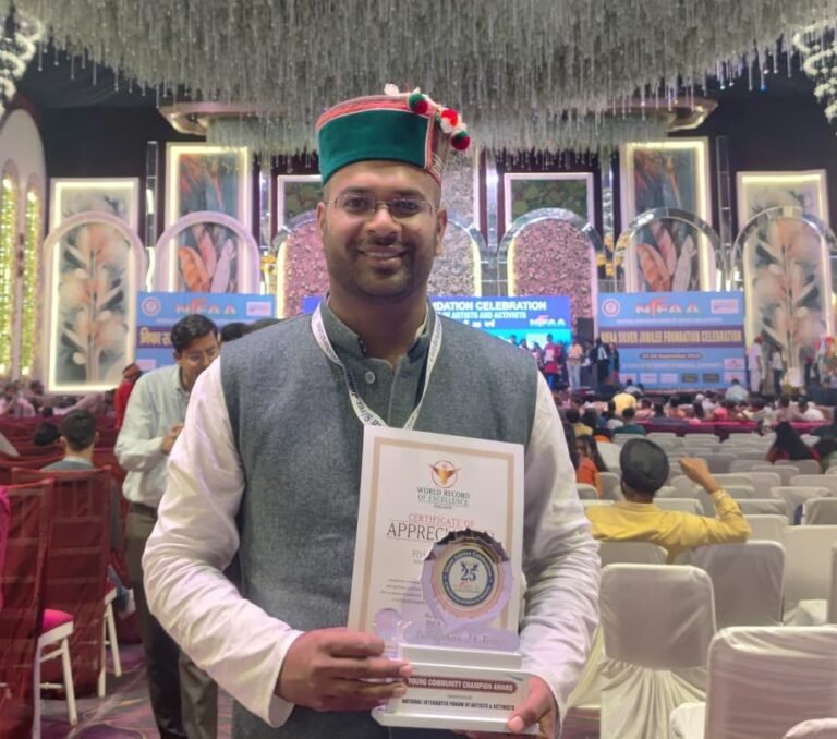 रामपुर बुशहर। जिला शिमला के रामपुर के रहने वाले युवा समाजसेवी पीयूष प्रार्थी को सामाजिक सेवा के क्षेत्र में उल्लेखनीय योगदान के लिए निफा (National Integrated Forum of Artists and Activists – NIFFA) द्वारा “यंग कम्युनिटी चैंपियन अवॉर्ड” से सम्मानित किया गया है। साथ ही उनका नाम “वर्ल्ड रिकॉर्ड ऑफ एक्सीलेंस बुक इंग्लैंड” में भी दर्ज किया गया है, जो कि हिमाचल प्रदेश के लिए गर्व की बात है।