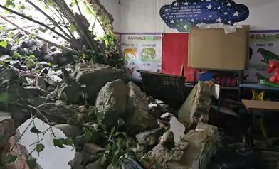 ऊना जिले के अबादा में भूस्खलन से स्कूल की दीवार टूट गई और सारा मलबे कमरे में घुस गया। स्रोत : सोशल मीडिया
