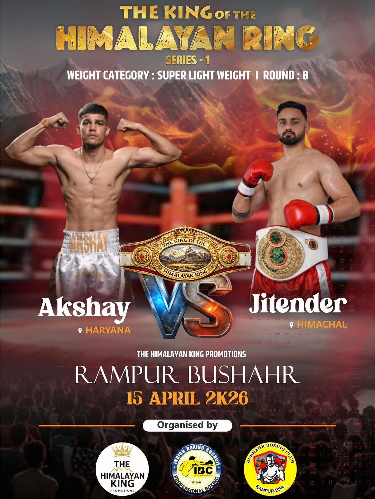 रामपुर बुशहर में 15 अप्रैल 2026 को हिमालयन टाइटल बॉक्सिंग फाइट का आयोजन होगा, जिसमें जितेंद्र ठाकुर और अक्षय चहल आमने-सामने होंगे। जानें दोनों बॉक्सरों का रिकॉर्ड और मुकाबले की पूरी जानकारी।