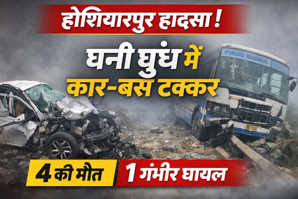 Hoshiarpur Accident : पंजाब के होशियारपुर जिले में शनिवार तड़के एक दर्दनाक सड़क हादसा हो गया। घनी धुंध के कारण दसूहा–होशियारपुर मुख्य मार्ग पर दोसड़का के पास एक कार पंजाब रोडवेज की बस से जा टकराई। इस भीषण दुर्घटना में चार लोगों की मौके पर ही मौत हो गई, जबकि एक युवक गंभीर रूप से घायल हो गया। हादसे की तीव्रता इतनी अधिक थी कि कार पूरी तरह से क्षतिग्रस्त हो गई और बस उसे करीब 200 मीटर तक घसीटते हुए ले गई।