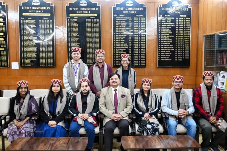 2025 बैच के प्रोबेशनर आईएएस अधिकारियों के एक दल ने शिमला में उपायुक्त अनुपम कश्यप से मुलाकात की। उपायुक्त ने सभी अधिकारियों को पारंपरिक शॉल और टोपी पहनाकर सम्मानित किया तथा उनके उज्ज्वल भविष्य की कामना की। इस दौरान अधिकारियों ने भी उपायुक्त को स्मृति चिन्ह भेंट किया।