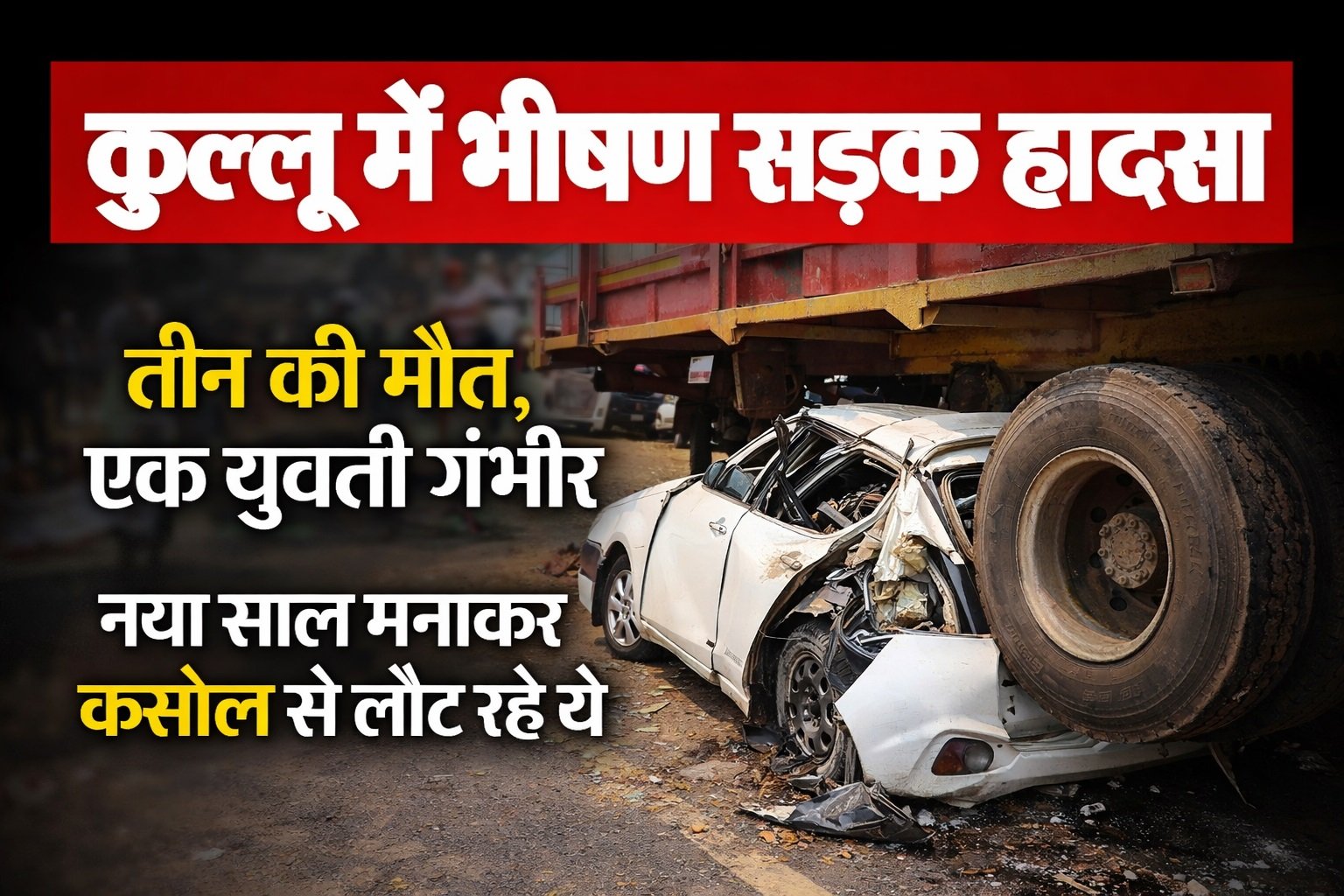 जानकारी के अनुसार, कसौल से लौटते समय एक कार अचानक अनियंत्रित हो गई और पहले सड़क किनारे लगे पैराफिट से टकराई। इसके बाद कार सड़क किनारे खड़े एक ट्रक के नीचे जा घुसी। टक्कर इतनी तेज थी कि कार पूरी तरह क्षतिग्रस्त हो गई। लोगों की मदद से पुलिस ने कड़ी मशक्कत के बाद कार में फंसे चारों युवाओं को बाहर निकाला और उन्हें तुरंत कुल्लू अस्पताल पहुंचाया गया, लेकिन अस्पताल में डॉक्टरों ने तीन युवाओं को मृत घोषित कर दिया, जबकि एक युवती की हालत गंभीर बनी हुई है। मृतकों में एक युवक की पहचान सतपाल निवासी कुल्लू के रूप में हुई है। अन्य दो युवतियों की शिनाख्त नहीं हो पाई है।