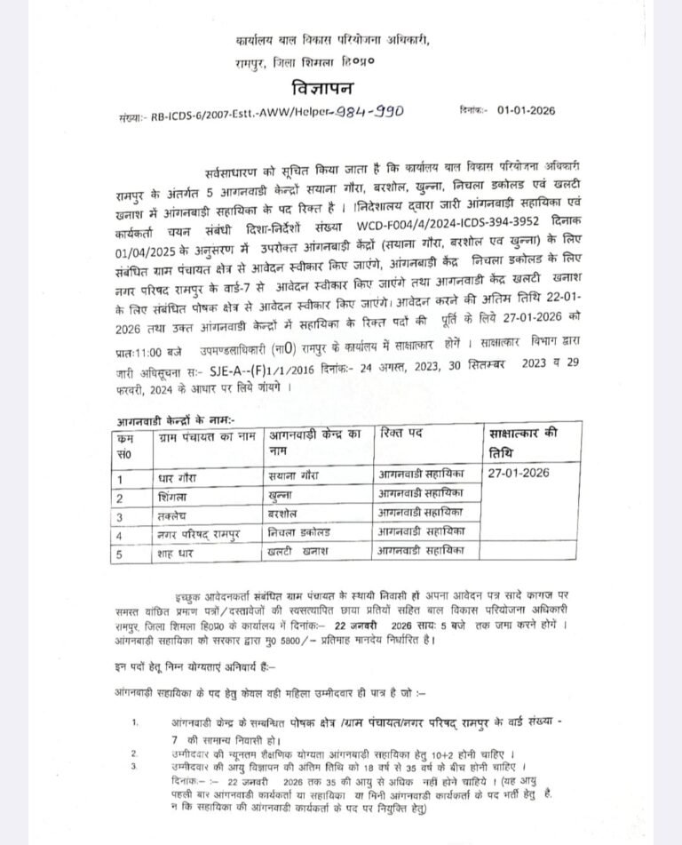 • Rampur Bushahr: रामपुर में क्रेच वर्कर और क्रेच हेल्पर पदों के लिए महिला उम्मीदवारों से आवेदन आमंत्रित