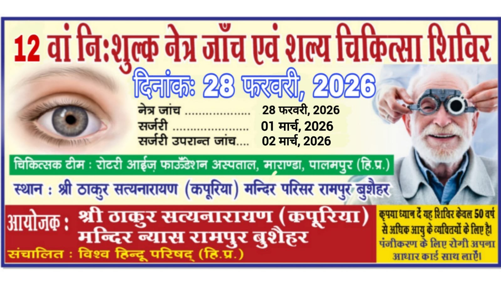 ठाकुर सत्यनारायण (कपूरिया) मंदिर न्यास, रामपुर 12वाँ निशुल्क आँखों का कैंप 28 फरवरी को आयोजित किया जा रहा है। इस कैंप में रोटरी आईज फाउंडेशन अस्पताल, मारान्डा (पालमपुर) के प्रसिद्ध नेत्र रोग विशेषज्ञ डॉ. रोहित अपनी विशेषज्ञ टीम के साथ सेवाएं प्रदान करेंगे।